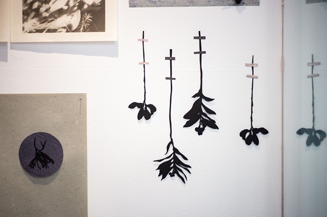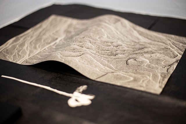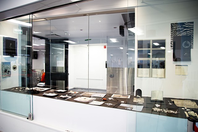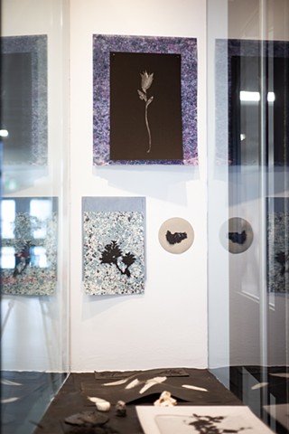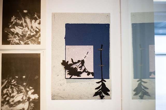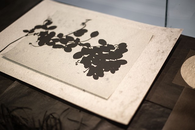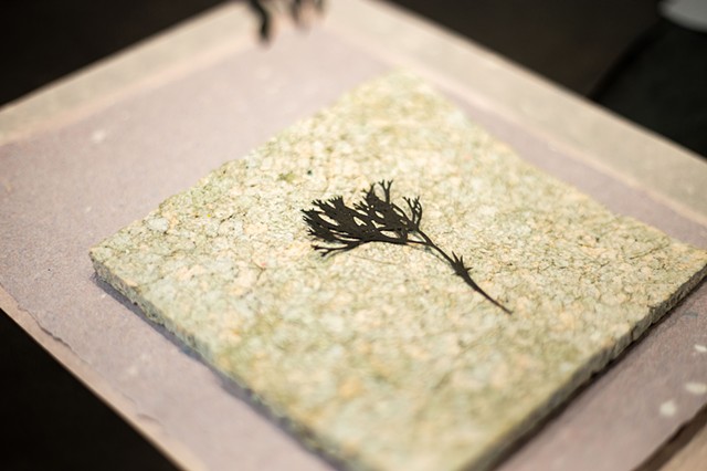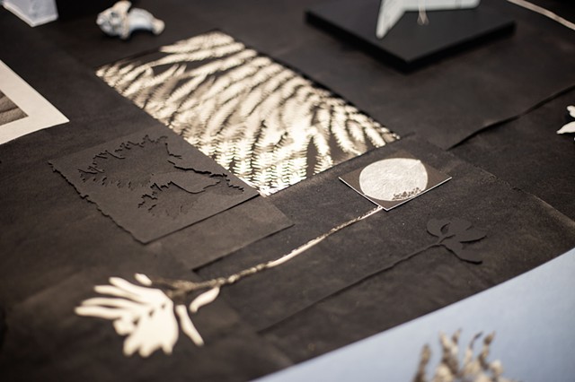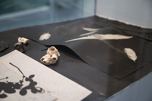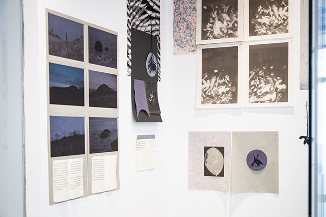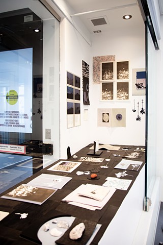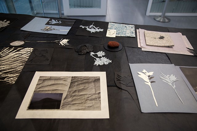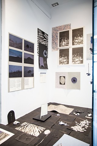 Impressions jet d’encre sur papier varié (photographies, numérisations, cyanotypes), papier de couleur varié, papier japonais et encre de Chine, marbrures sur papier varié, textes (papier et carton), objets fabriqués (papier varié découpé à l’exacto, pâte de papier, bois, peinture acrylique), objets naturels (roches, coquillages)
